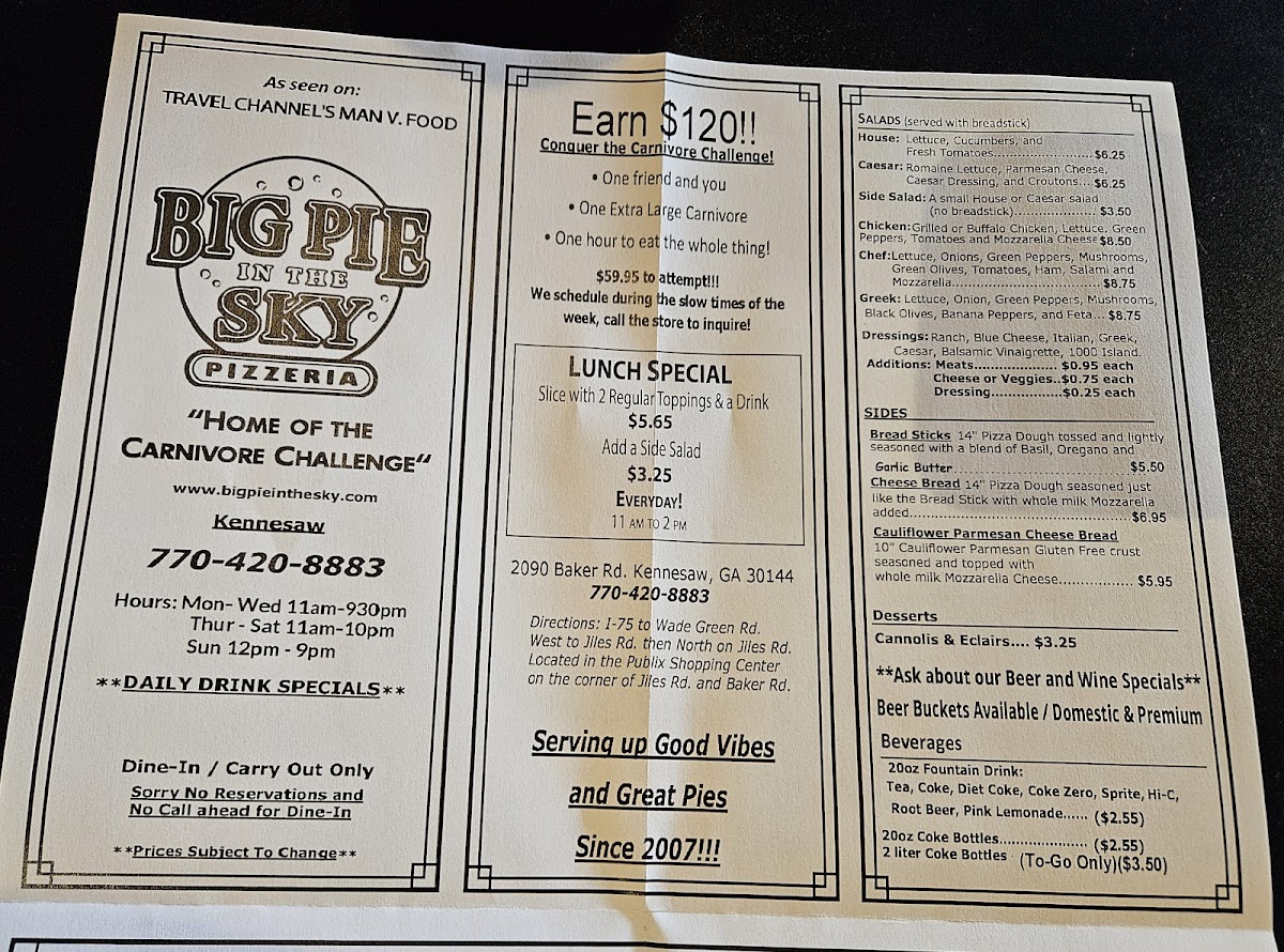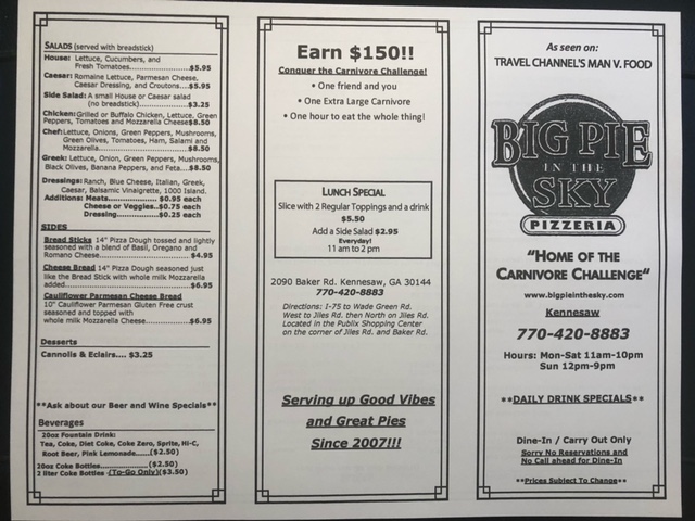 If you're in the mood for a satisfying slice of pizza, the Big Pie In The Sky Pizzeria Menu has something that'll hit the spot. Located at 2090 Baker Rd Suite A-103, Kennesaw, GA, this local gem offers a variety of mouthwatering options that’ll make you feel right at home. Whether you're craving a classic Margherita or something a bit more adventurous, there’s a pizza for every taste.